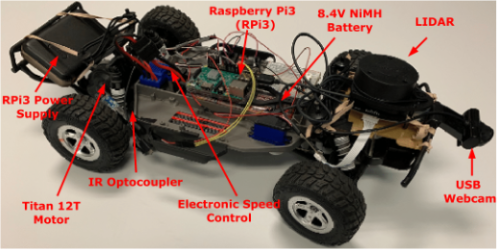 DeepNNCar TestbedTo implement, validate, and test our research products, we have mainly used the CARLA simulator and the DeepNNCar. While CARLA is a well-known open-source urban driving simulator, DeepNNCar is a low-cost research testbed that was designed in the Smart and Resilient Computing for Physical Environments Lab (SCOPE). DeepNNCar is built upon the chassis of Traxxas Slash 2WD 1/10 Scale RC car and is mounted with a USB forward-looking camera, IR- optocoupler, and a 2D LIDAR. The speed and steer for the robot are controlled using pulse-width modulation (PWM), by varying the duty cycle. [Recommended Reading] [Web Content]